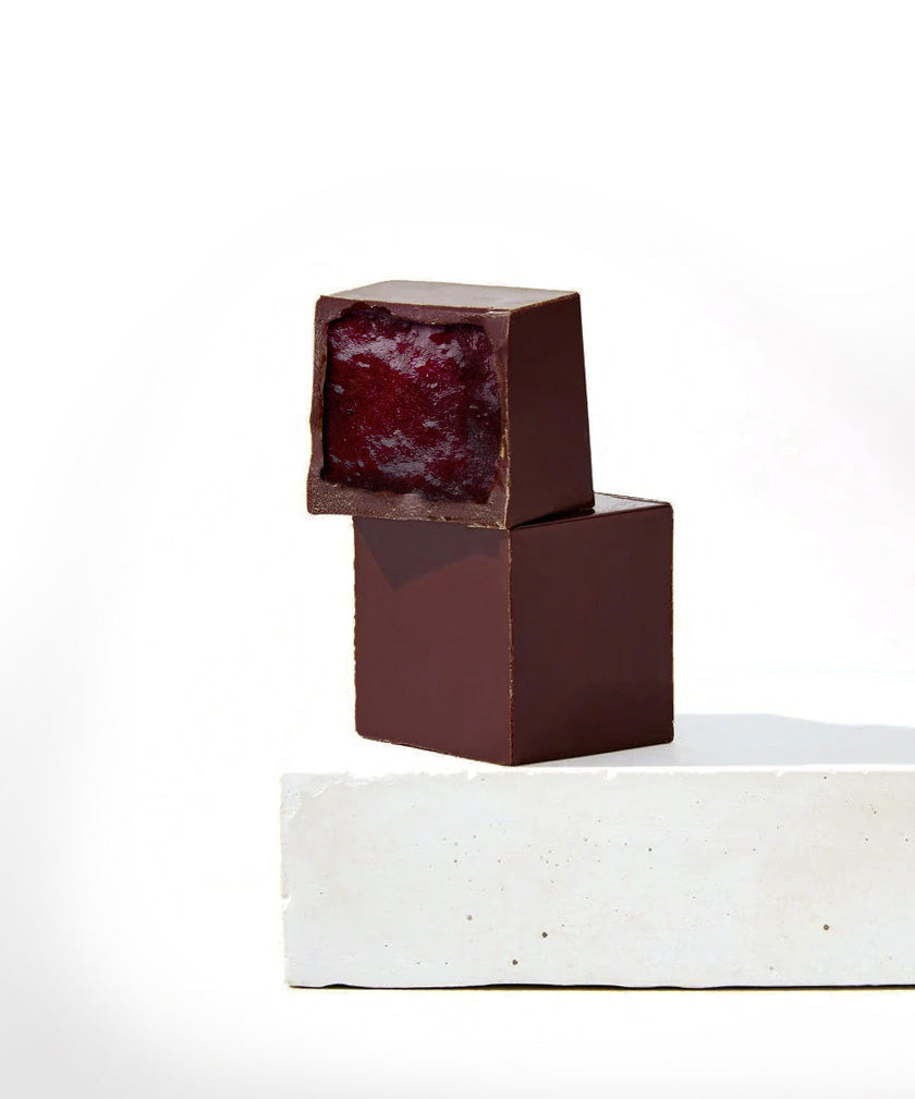 Bonbons din ciocolată de specialitate 100% și cireșe amare crude în miere. Umplutura este realizată doar din fructe crude și miere, fără zahăr adăugat. Procesate la sub 38°C pentru a păstra enzimele, vitaminele și antioxidanții naturali.