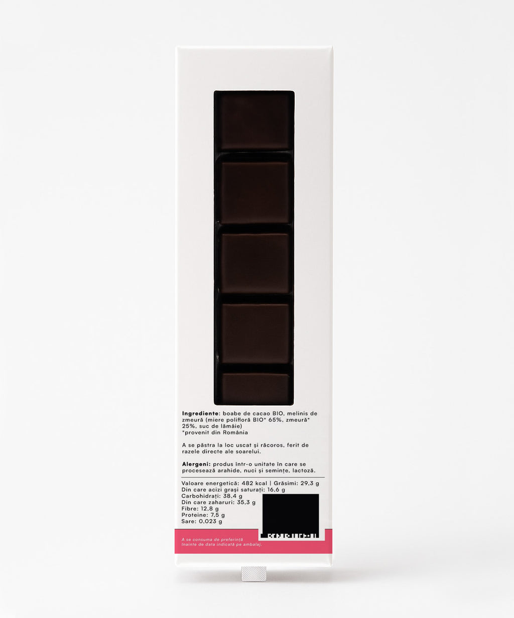 • Miez de Melinis de zmeură (miere polifloră BIO provenită din România 65%, zmeură 25%, suc de lămâie)