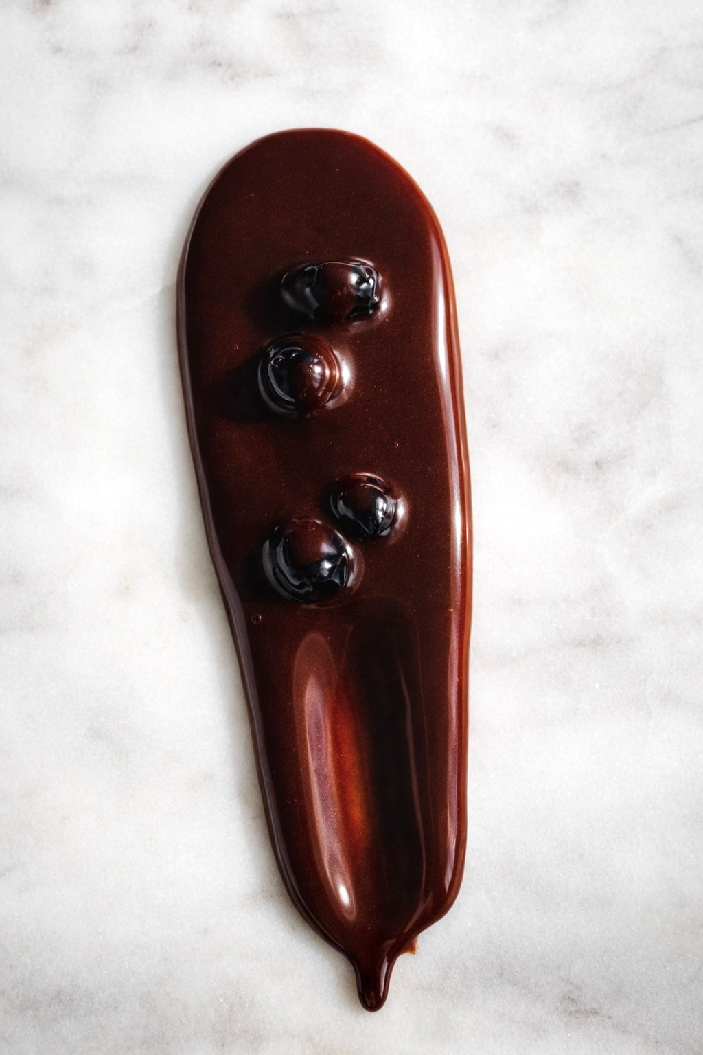 Peste această bază adăugăm ciocolată bean-to-bar 100% cacao, pentru caracter, profunzime și o textură tartinabilă.