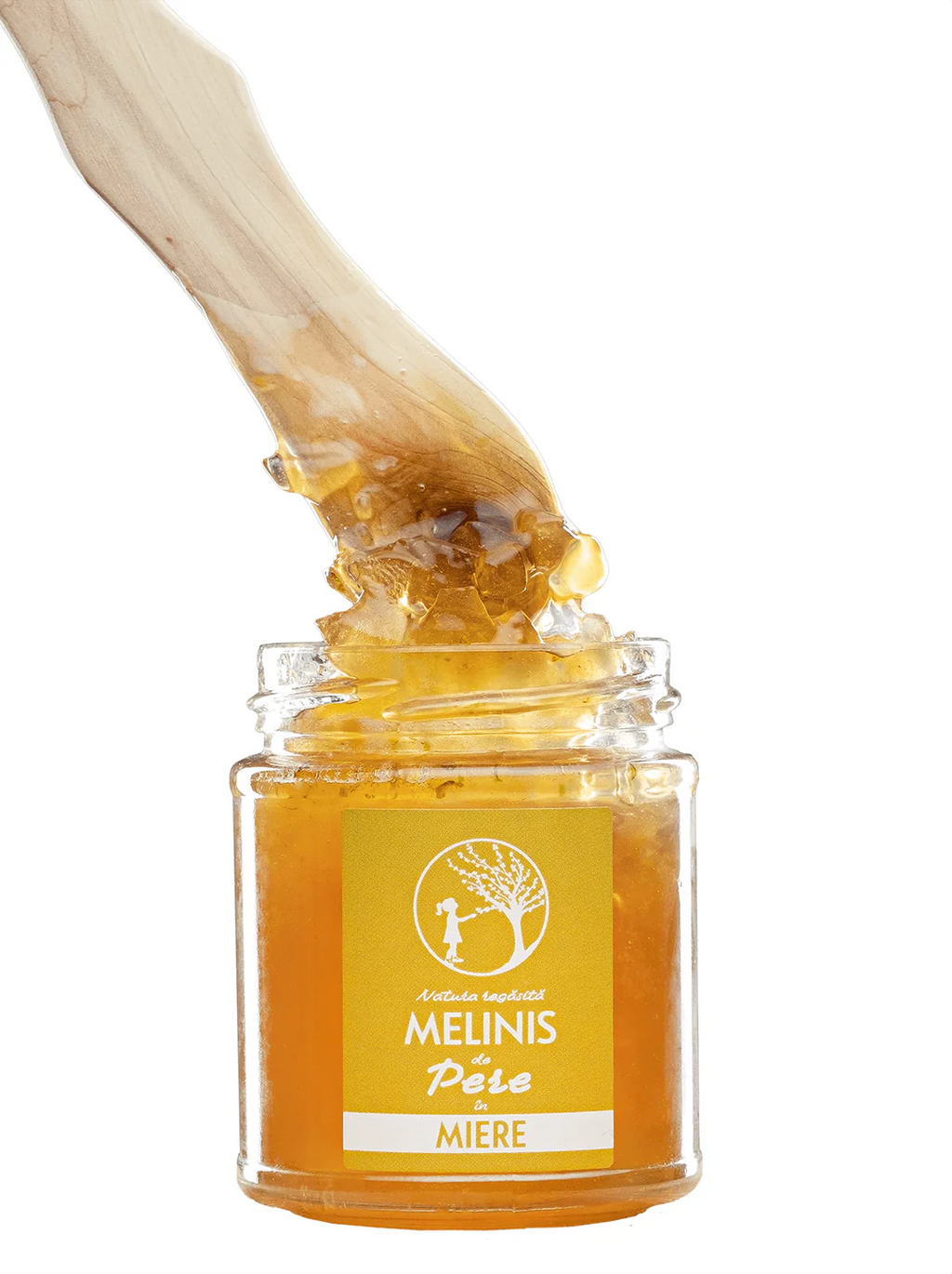 Din dorința de a crea un produs surprinzător, cu un gust și cu o textură aparte, am reunit piersicile de toamnă sau piersicile de vie, așa cum mai sunt ele cunoscute în popor, cu mierea polifloră și am obținut Melinis cremă de piersici, un produs tartinabil ce poate fi servit în nenumărate modalități - de la utilizarea zilnică, dimineața, a unei lingurițe de Melinis cremă de piersici, până la servirea acestei creme pe pâine prăjită ori pe oricare alt produs de patiserie, vei fi surprins de aroma fină a piersicilor și de delicatețea oferită de miere. În plus, pentru un gust și mai special, am adăugat un strop de cătină certificată ecologic, care îi oferă produsului o tentă ușor acrișoară.