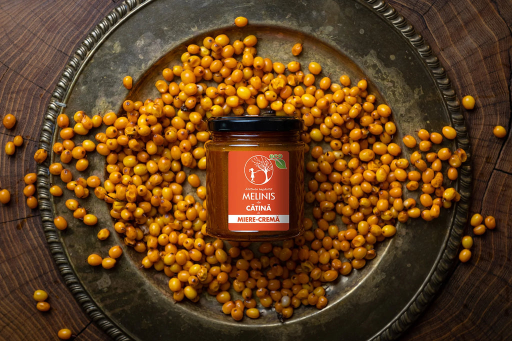 Cunoscută din cele mai vechi timpuri pentru numeroasele beneficii pe care le are asupra sănătății, cătina, în varianta ECO, cu 50% suc de cătină și miere ECO polifloră, oferă cel mai catifelat gust de care te poți bucura. Discutăm despre un amestec de miere cu cătină care poate fi depozitat la temperatura camerei, borcanul nu trebuie să fie închis ermetic si nici tinut la frigider, iar acesta este un mare avantaj al Melinisurilor, indiferent de sortiment.
