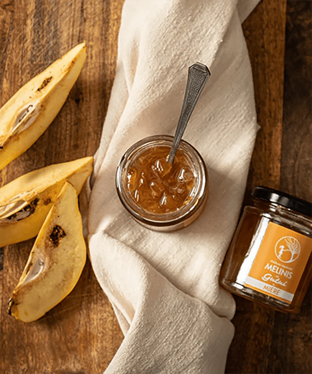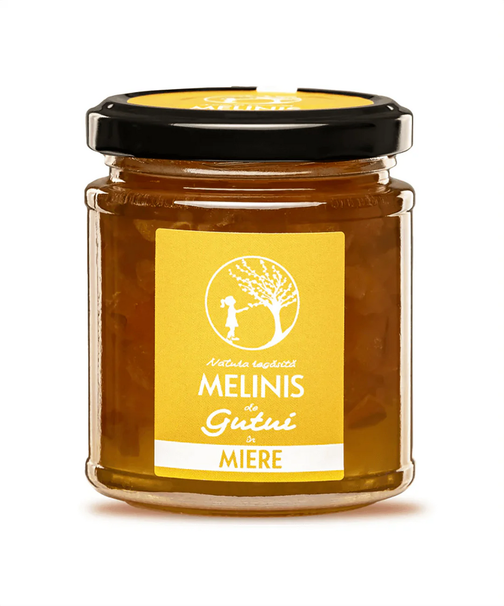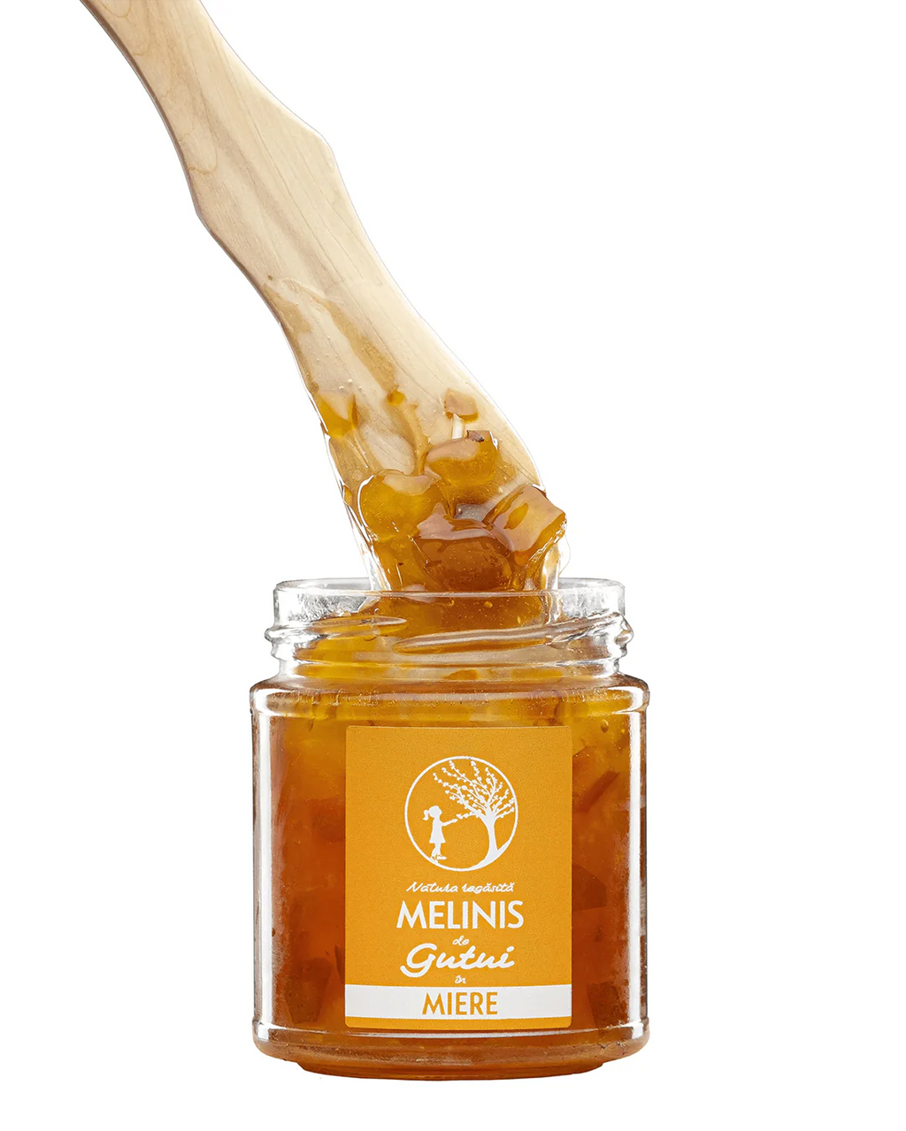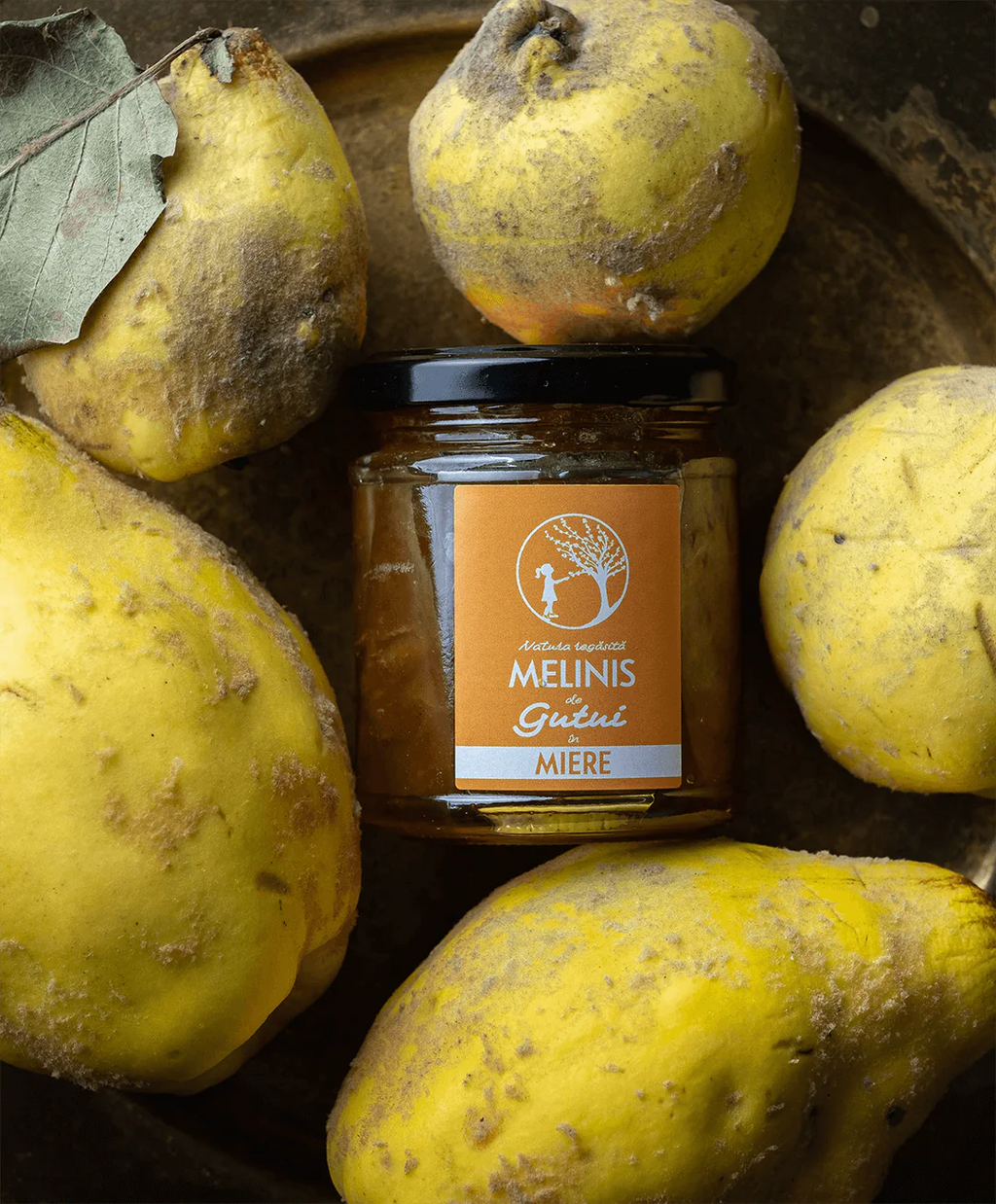 De la nuanțele suave de galben și până la tonurile pline de vitalitate, gutuile sunt o încântare pentru papilele gustative și o sursă veritabilă de minerale pentru organism. Pentru obținerea Melinisului parfumat de gutui folosim soiul de gutui Bereczki, cu un gust dulce, ușor acidulat, provenit de pe malul Nișcovului, dar și de la alți producători din zona Buzăului. În plus, pentru a obține o savoare unică, am adăugat și un strop de Geranium (Drusaim).
