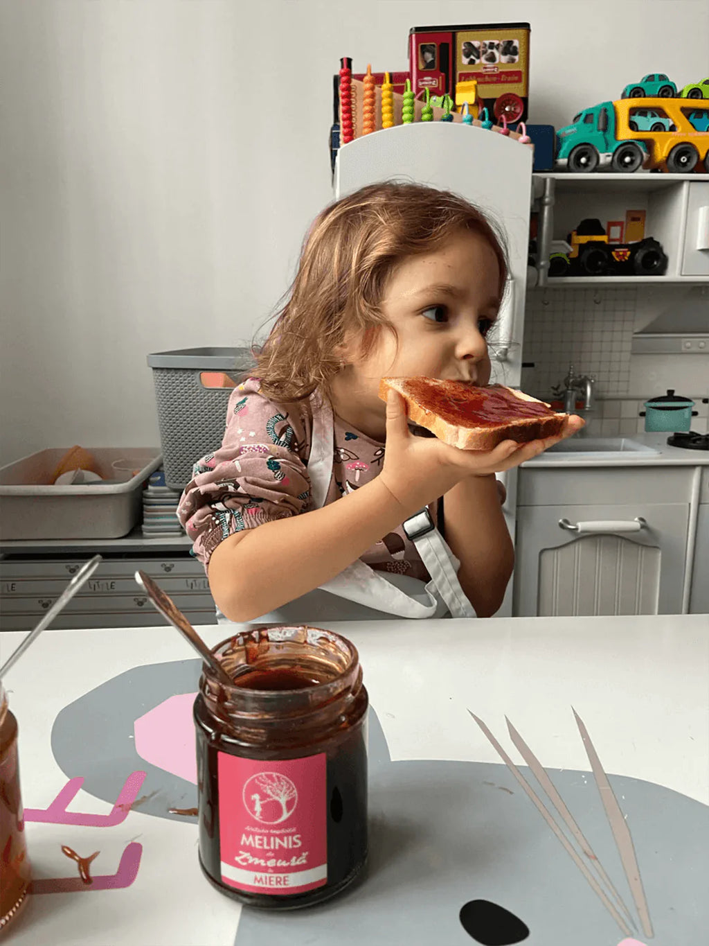 Am păstrat culoarea spectaculoasă a zmeurei și textura catifelată a acesteia în mierea limpede de salcâm, obținând textura ideală pentru tartinat.